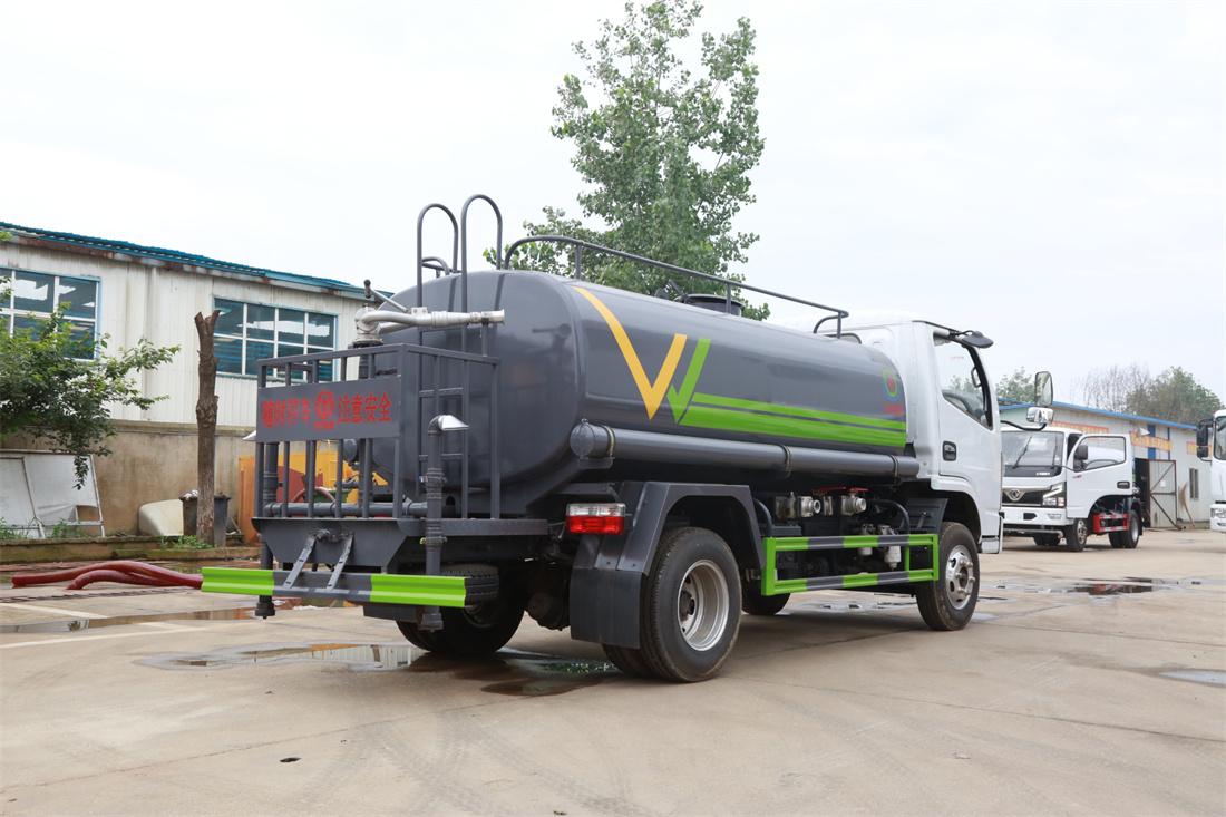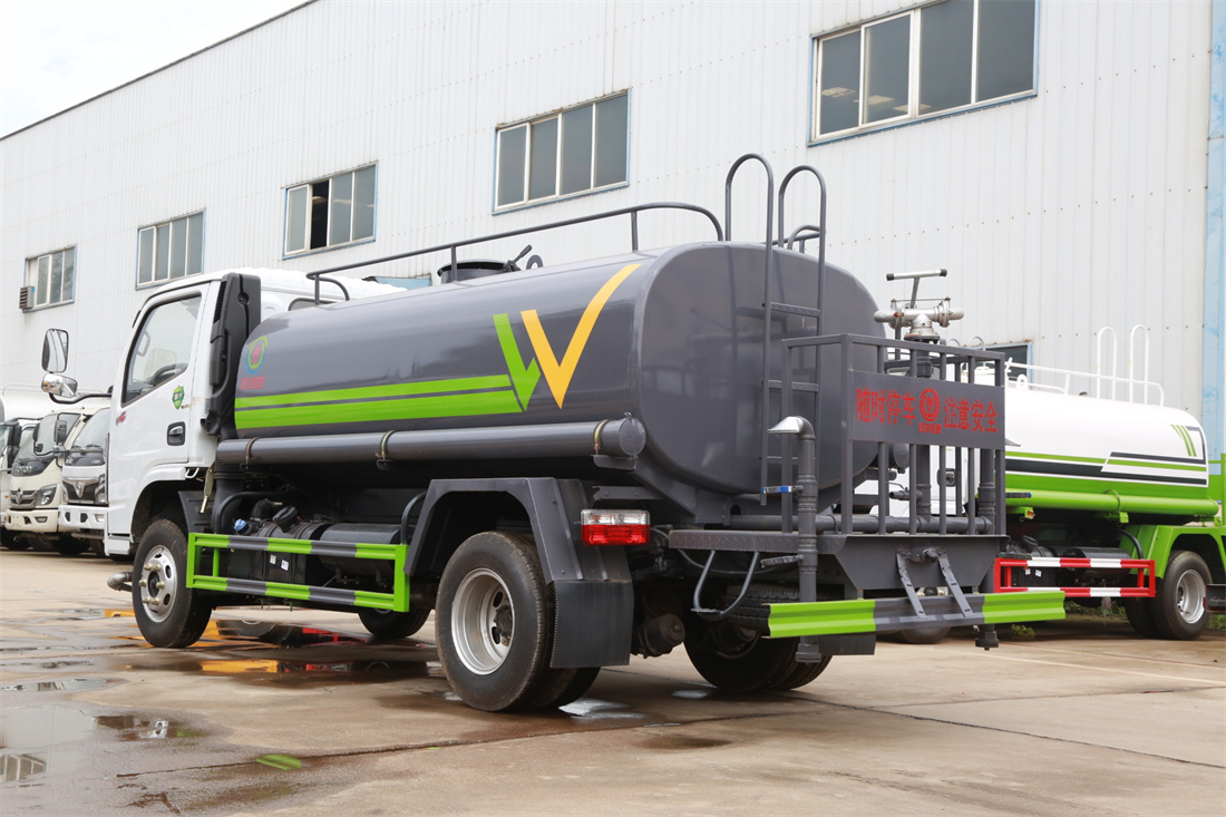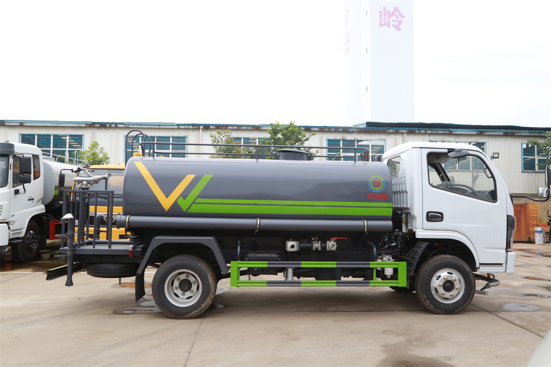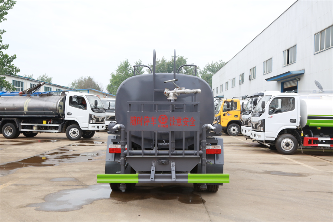 灑水車前裝有鴨形噴嘴或圓頭沖嘴,后面裝有圓柱開(kāi)灑水噴嘴或蓮蓬頭噴嘴,后部有一工作平臺(tái),裝配有水炮。后部還可裝8個(gè)噴嘴(選裝)。