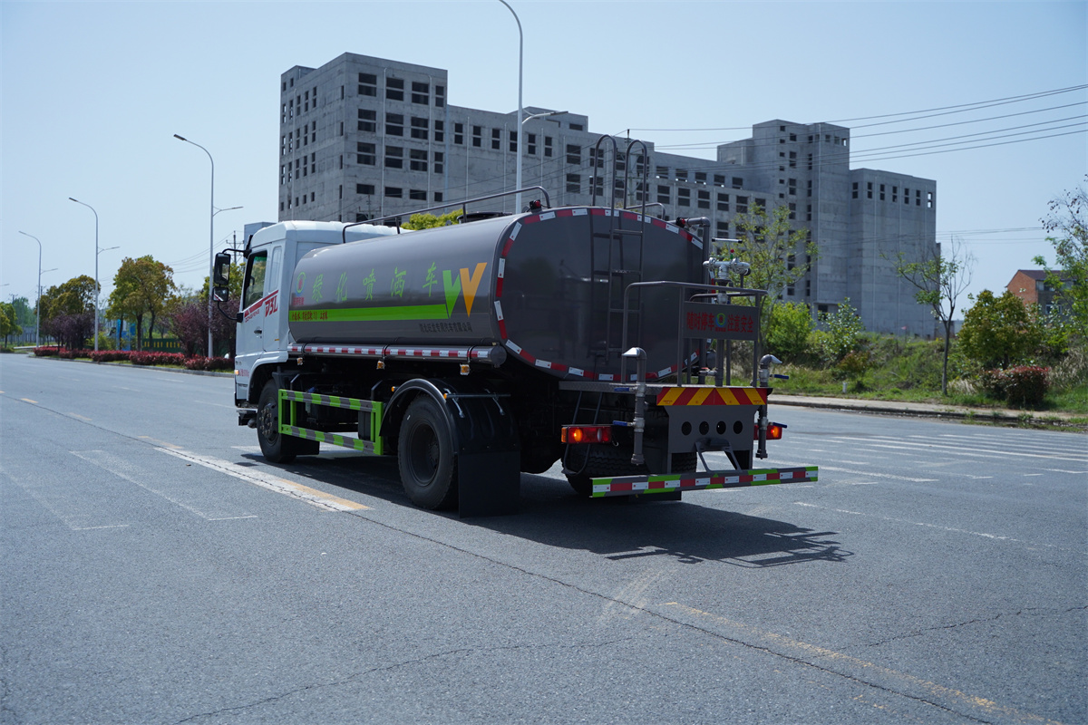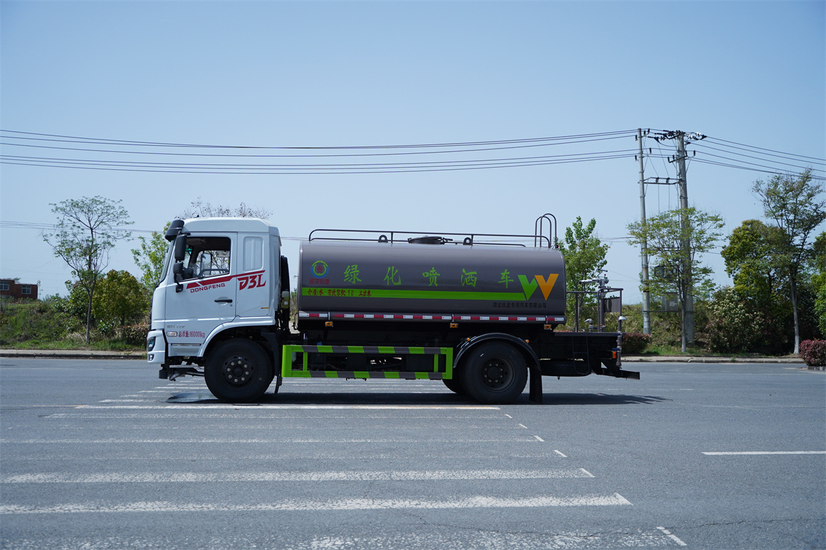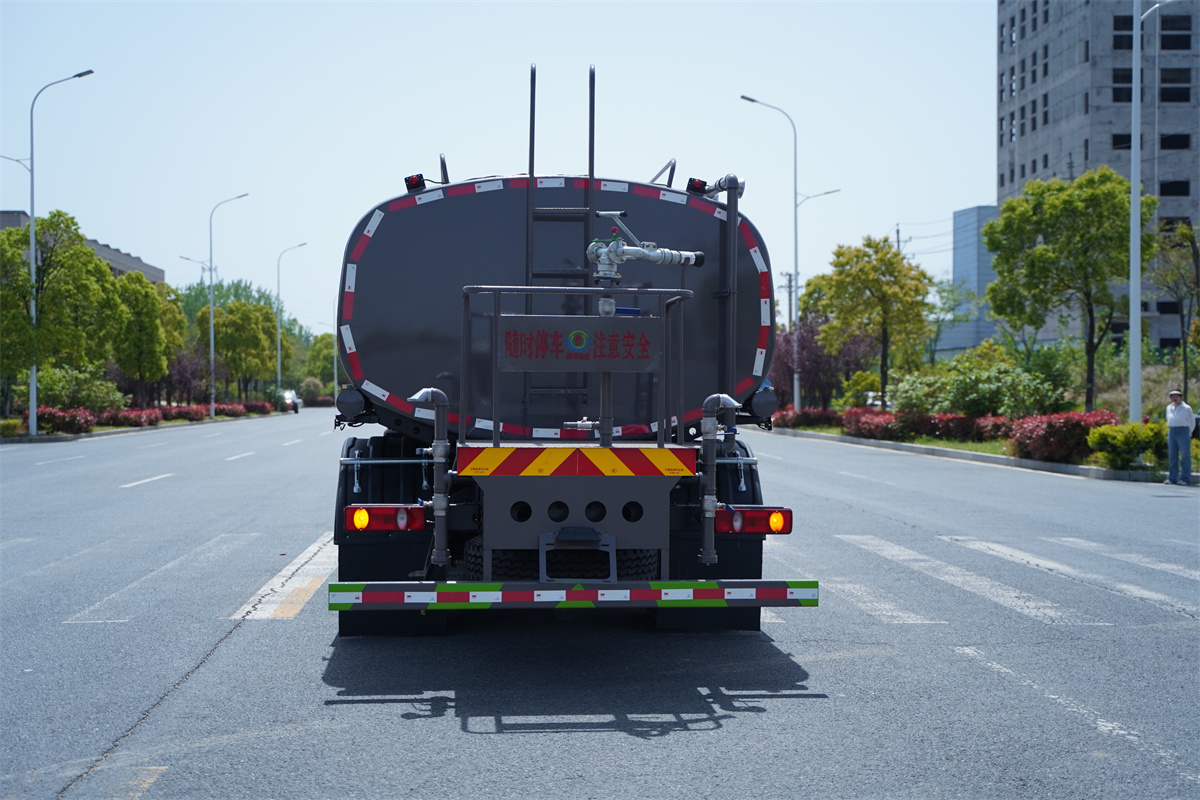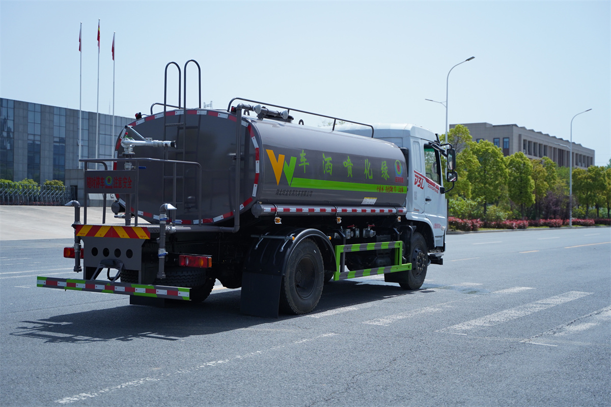 灑水車前裝有鴨形噴嘴或圓頭沖嘴,后面裝有圓柱開灑水噴嘴或蓮蓬頭噴嘴,后部有一工作平臺(tái),裝配有水炮。后部還可裝8個(gè)噴嘴(選裝)。