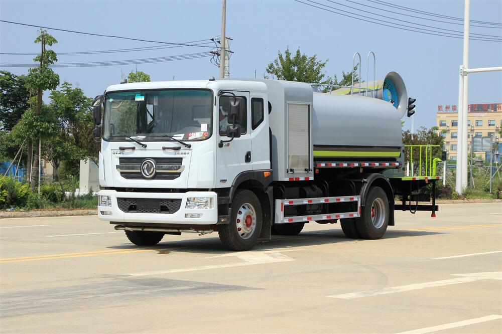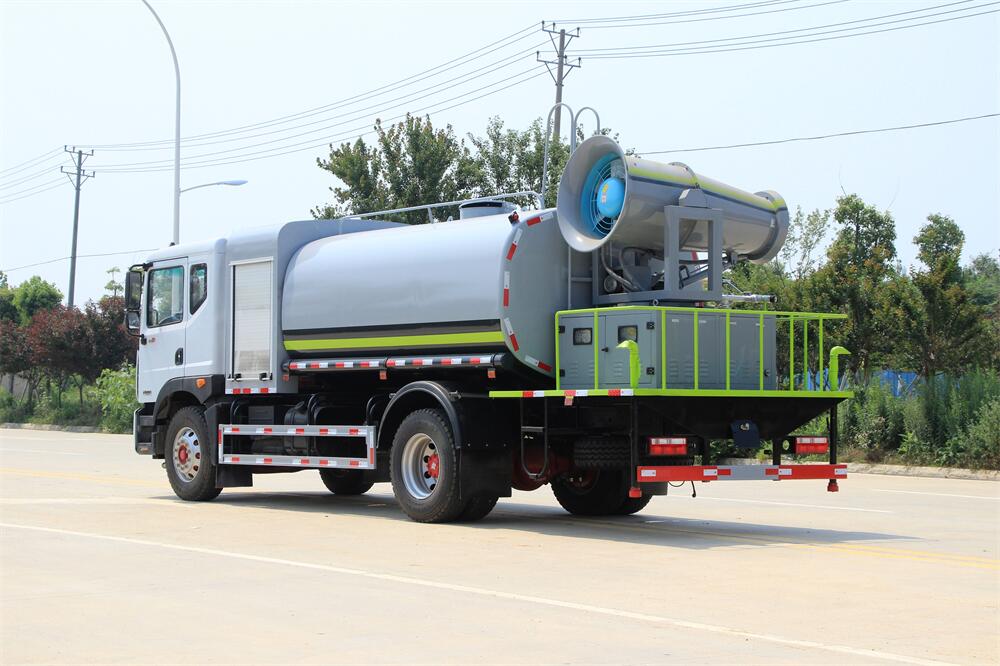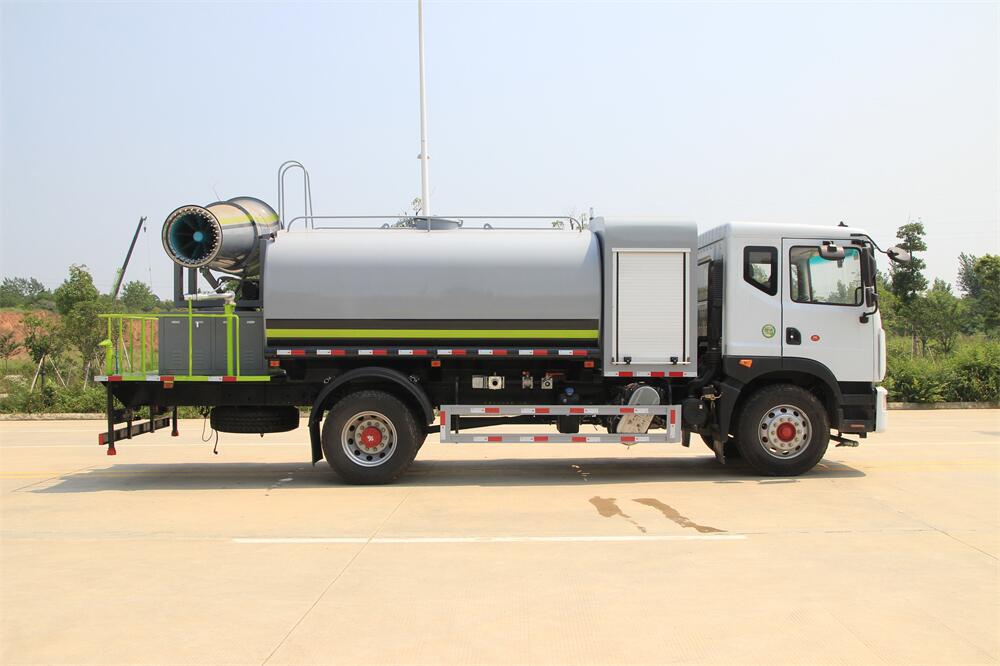 上裝配置:罐體容積為 12立方,選配風送式霧炮機組射程30米、40米、50米、60米、80米、100米、120米霧炮,罐體鋼板為4mm碳鋼Q235材質,罐內隔板具有防波作用,以減輕汽車行駛時罐體液體沖擊,罐體及整車外形尺寸按照公告。帶大功率專用灑水泵,泵可自吸自排,整車前沖、后灑、側噴、帶65消防接口,后平臺配CLW-50、CLW-60、CLW-80、CLW-100、CLW-120型風送式霧炮機組;罐體前封頭配大功率柴油發電機組;前封頭帶水位計,后平臺主管路帶1寸澆花接口,后爬梯。帶兩根輸水管及陰陽端。罐體顏色:銀/灰/綠,罐體兩側噴“多功能抑塵車”字樣,貼反光標示。