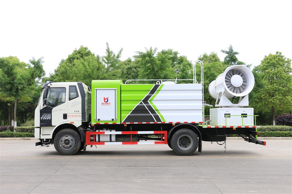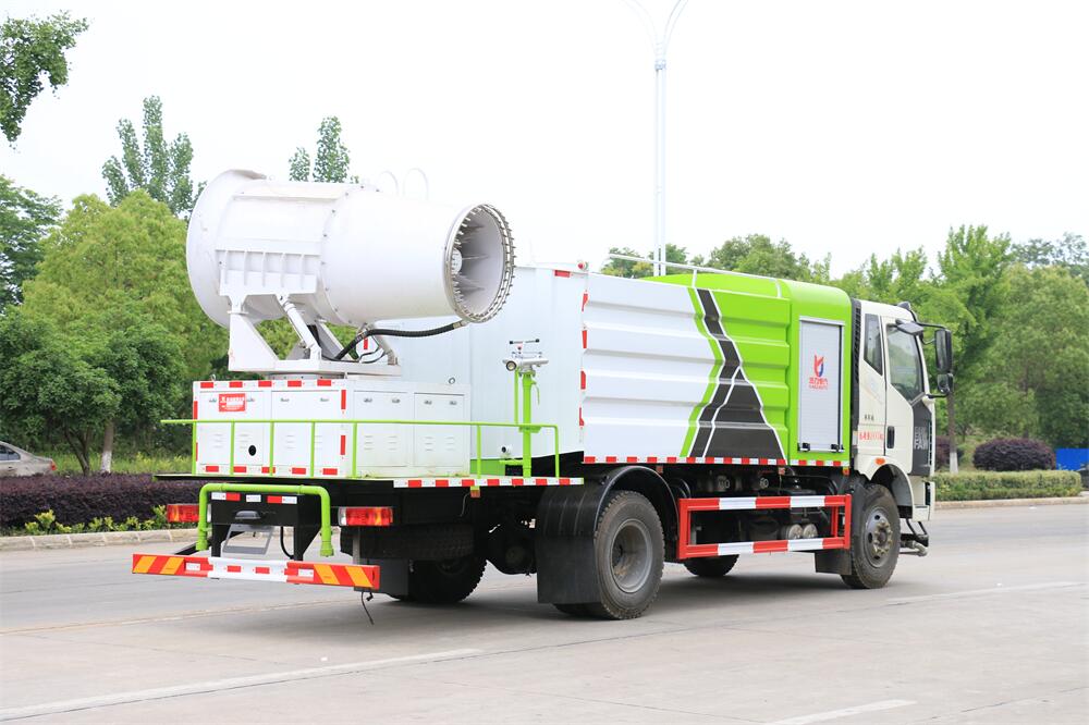 上裝配置:罐體容積為 12立方,選配風(fēng)送式霧炮機(jī)組射程30米、40米、50米、60米、80米、100米、120米霧炮,罐體鋼板為4mm碳鋼Q235材質(zhì),罐內(nèi)隔板具有防波作用,以減輕汽車行駛時(shí)罐體液體沖擊,罐體及整車外形尺寸按照公告。帶大功率專用灑水泵,泵可自吸自排,整車前沖、后灑、側(cè)噴、帶65消防接口,后平臺(tái)配CLW-50、CLW-60、CLW-80、CLW-100、CLW-120型風(fēng)送式霧炮機(jī)組;罐體前封頭配大功率柴油發(fā)電機(jī)組;前封頭帶水位計(jì),后平臺(tái)主管路帶1寸澆花接口,后爬梯。帶兩根輸水管及陰陽端。罐體顏色:銀/灰/綠,罐體兩側(cè)噴“多功能抑塵車”字樣,貼反光標(biāo)示。