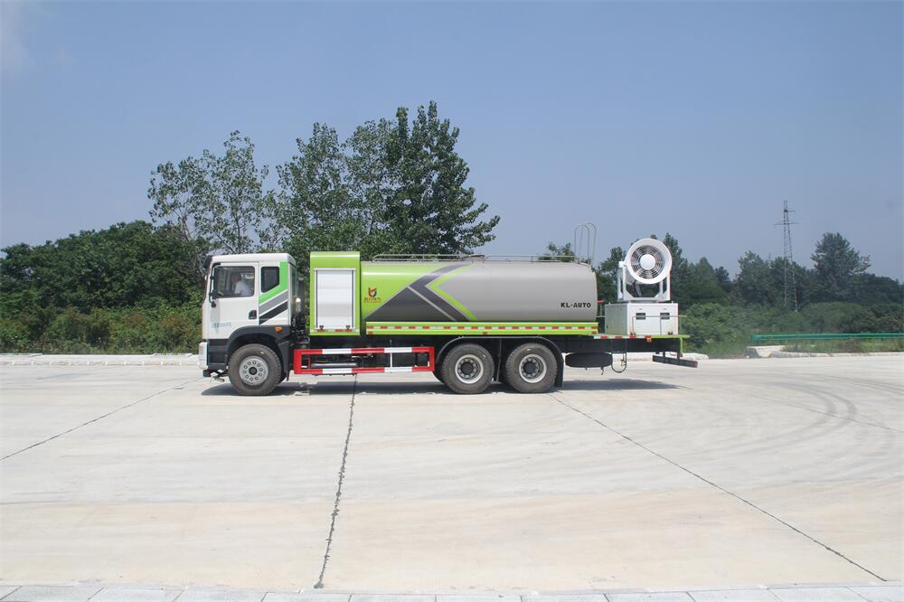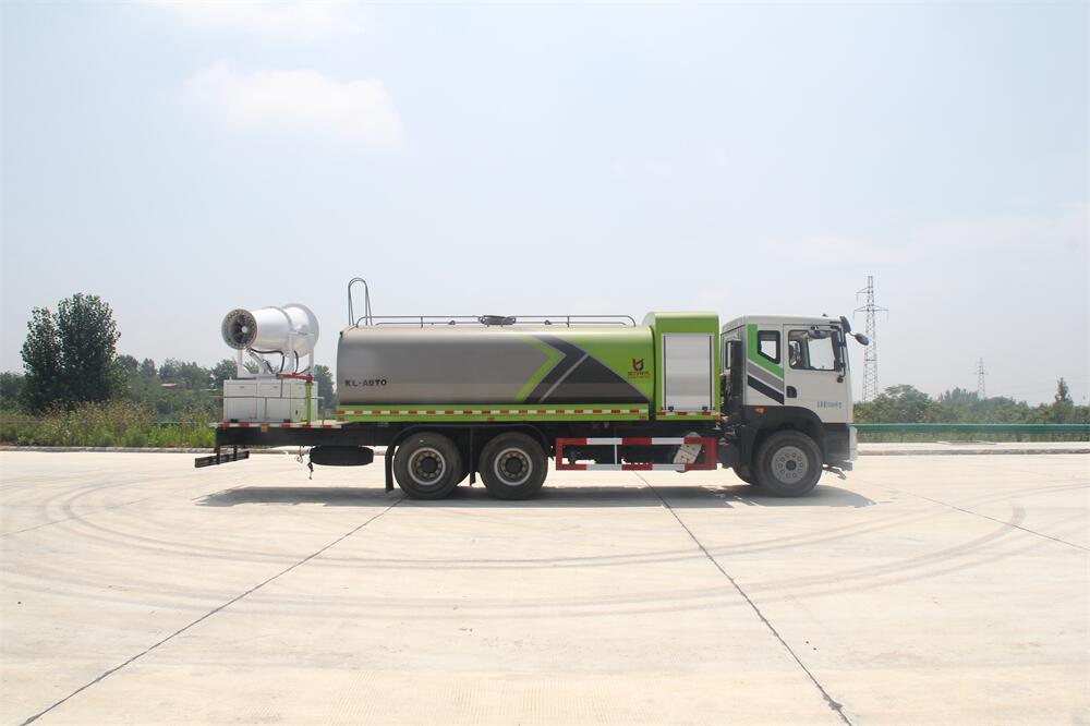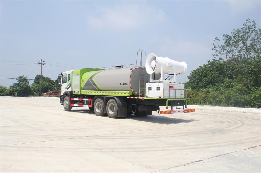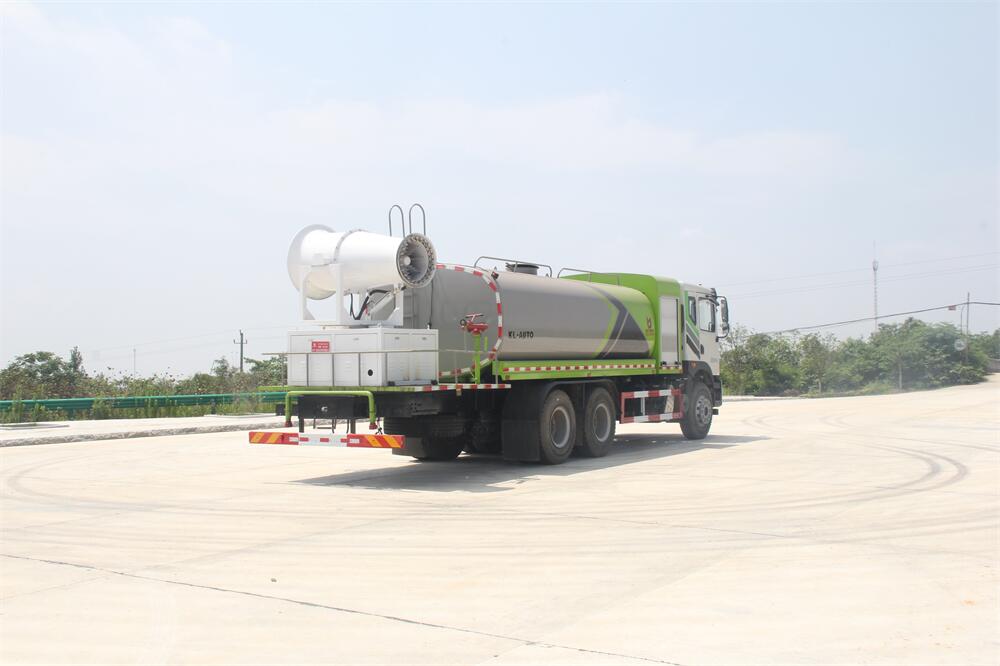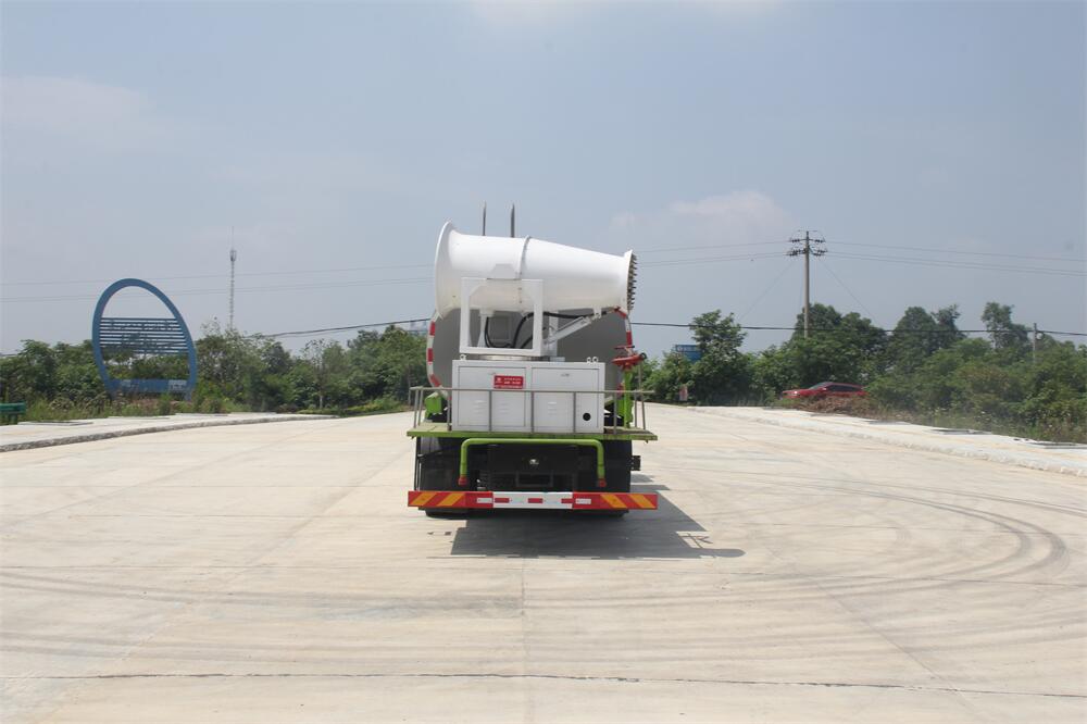 上裝配置:罐體容積為 16立方,選配風(fēng)送式霧炮機(jī)組射程30米、40米、50米、60米、80米、100米、120米霧炮,罐體鋼板為4mm碳鋼Q235材質(zhì),罐內(nèi)隔板具有防波作用,以減輕汽車(chē)行駛時(shí)罐體液體沖擊,罐體及整車(chē)外形尺寸按照公告。帶大功率專(zhuān)用灑水泵,泵可自吸自排,整車(chē)前沖、后灑、側(cè)噴、帶65消防接口,后平臺(tái)配CLW-50、CLW-60、CLW-80、CLW-100、CLW-120型風(fēng)送式霧炮機(jī)組;罐體前封頭配大功率柴油發(fā)電機(jī)組;前封頭帶水位計(jì),后平臺(tái)主管路帶1寸澆花接口,后爬梯。帶兩根輸水管及陰陽(yáng)端。罐體顏色:銀/灰/綠,罐體兩側(cè)噴“多功能抑塵車(chē)”字樣,貼反光標(biāo)示。