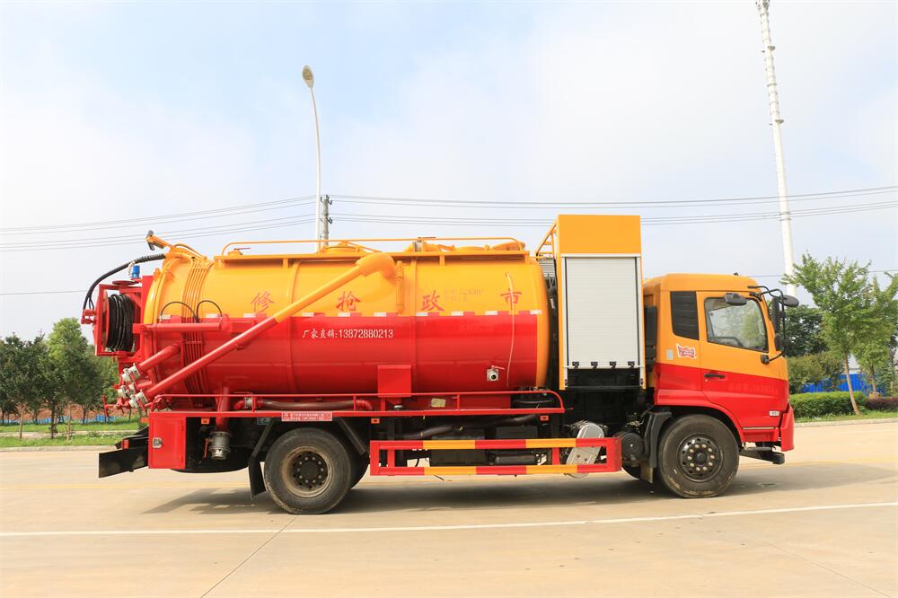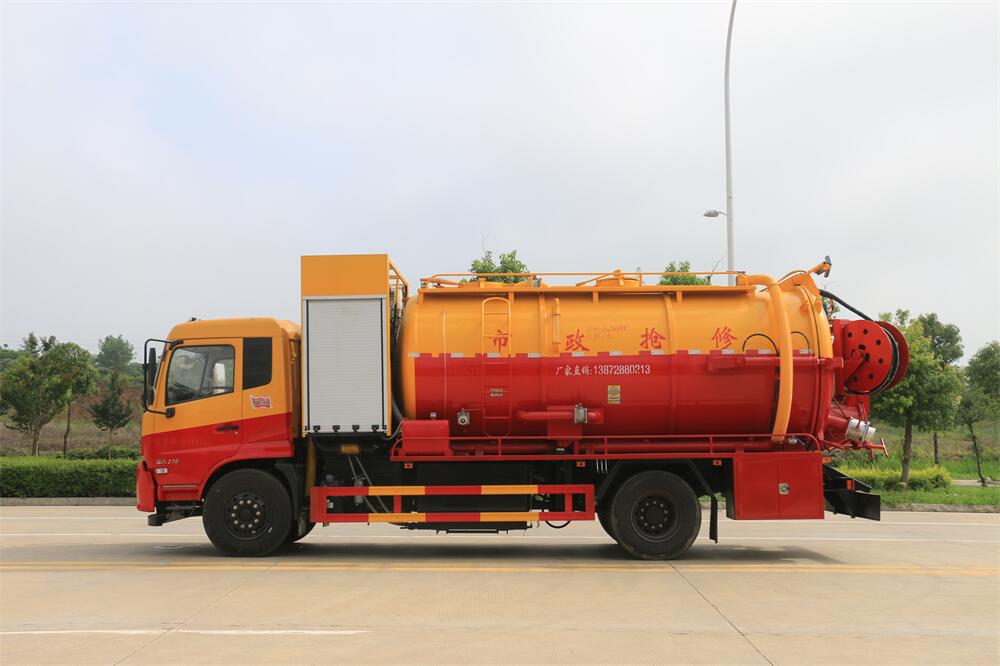 15方15方清洗吸污車-東風天錦15方10+5清洗吸污兩用車-帶副發動機圓罐紅黃色