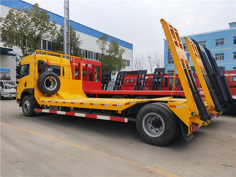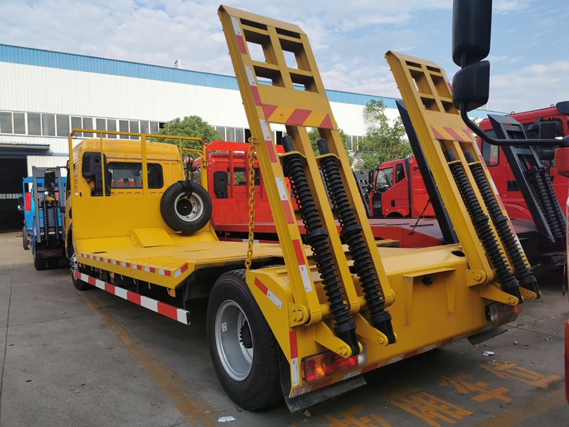 上裝采用五毫米花紋鋼板,整體凹梁設計,加強雙簧爬梯,可拉15噸以下挖機。