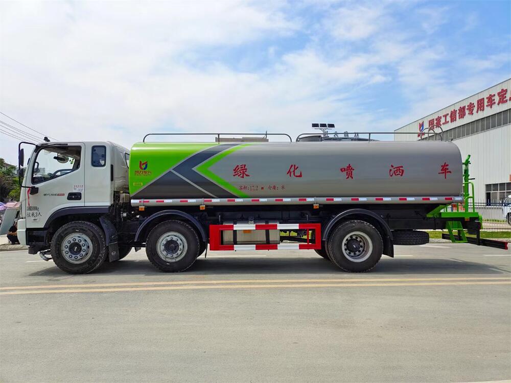 灑水車前裝有鴨形噴嘴或圓頭沖嘴,后面裝有圓柱開灑水噴嘴或蓮蓬頭噴嘴,后部有一工作平臺,裝配有水炮。后部還可裝8個噴嘴(選裝)。